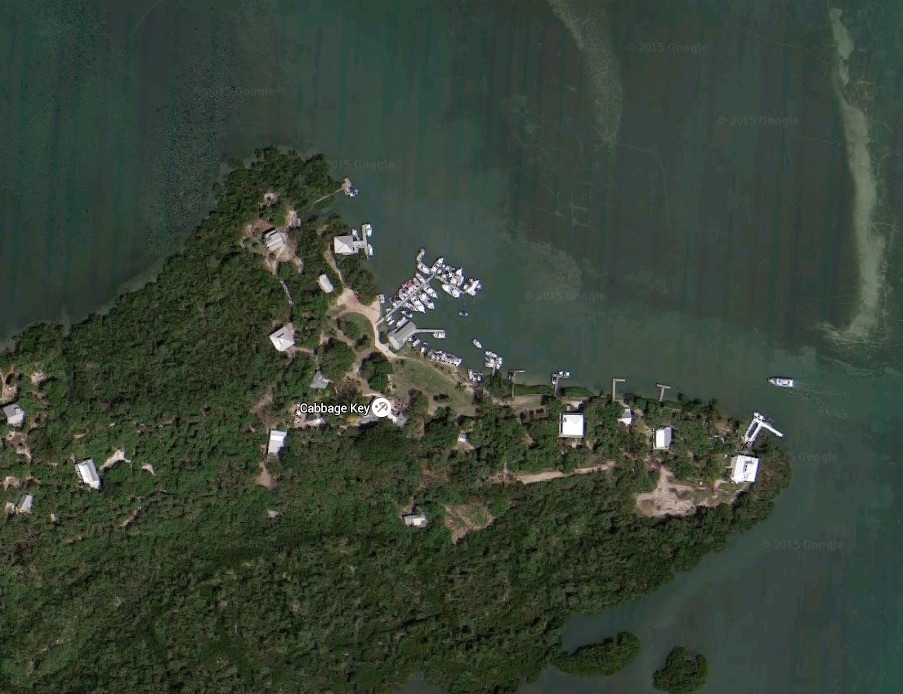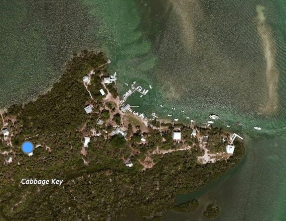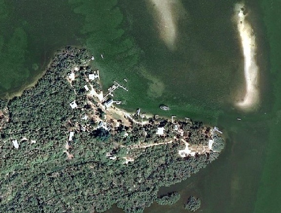 For this Cabbage Key location, Bing had an unfortunate glare so the top half of its image is not nearly as useful as the other two. However, it does give the clearest view of the trough along the southeastern edge of the island towards the bottom right.