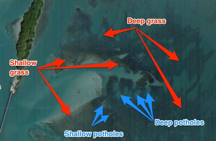Also, both Google and Mapquest show that the mangrove point just left of the big dock contains nice looking grass containing potholes near a mangrove shoreline, which is a great combination (I’ve never fished that point before, but I’ll definitely give it a shot next time I go there for lunch).
