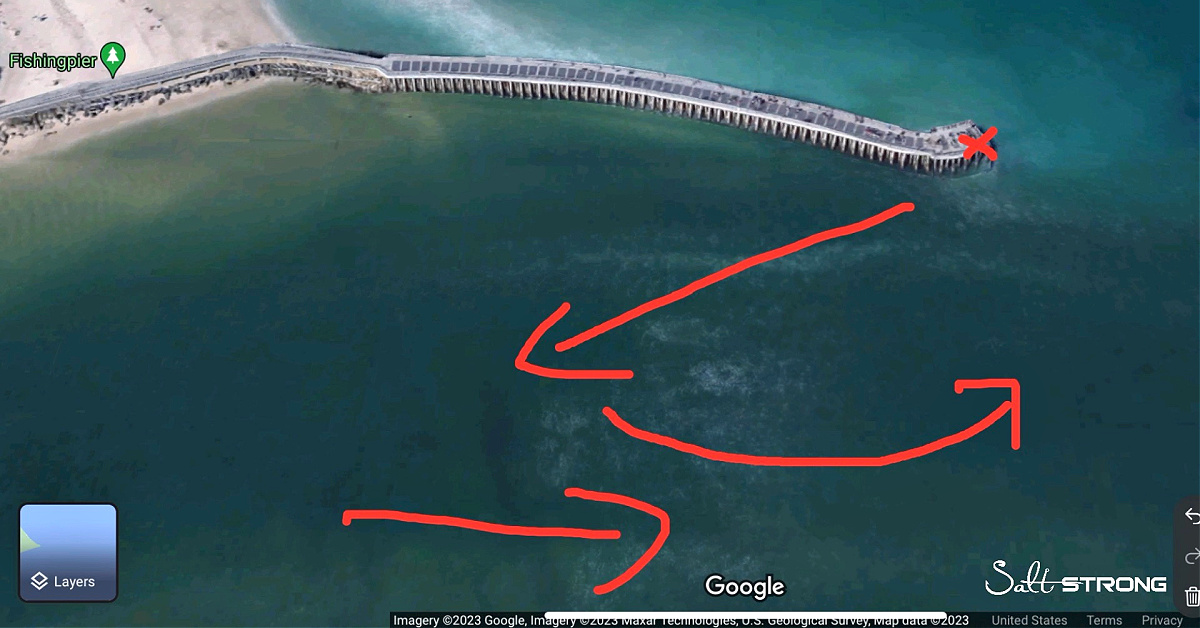 For this scenario, let’s say we have an outgoing tide coming out of the inlet next to this pier.