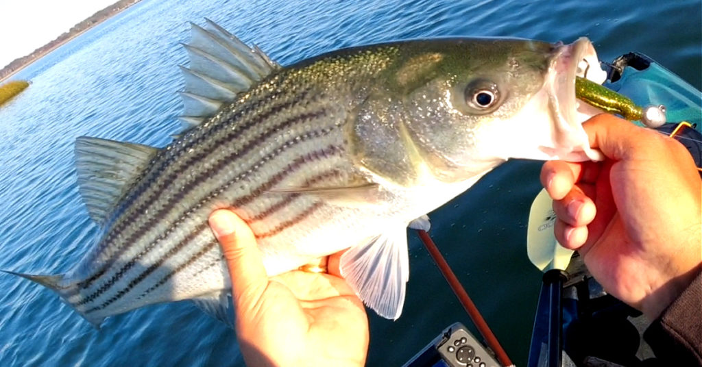 Great question. The bite can change between different lures quite often. Sometimes its a topwater bite, sometimes its subsurface, and sometimes its live bait. When targeting striped bass in the fall I typically bring the following.. Topwater – Spook Jr and Moonwalker…. Subsurface soft plastics- Slam Shady and Alabama Leprechaun (larger sizes) paired with 1/2 oz jigs, Dartspins (up to 7inch). I also do like suspending lures like the Mirrolures.