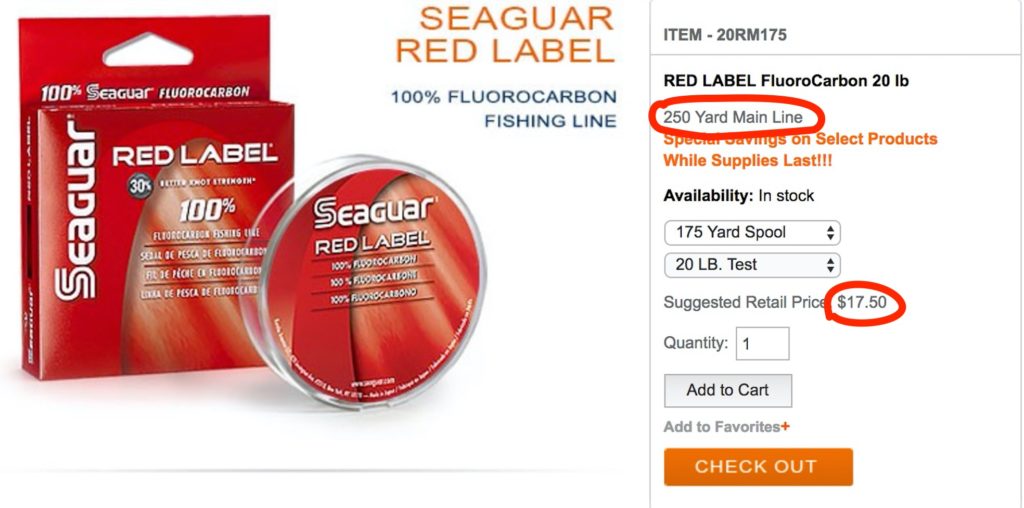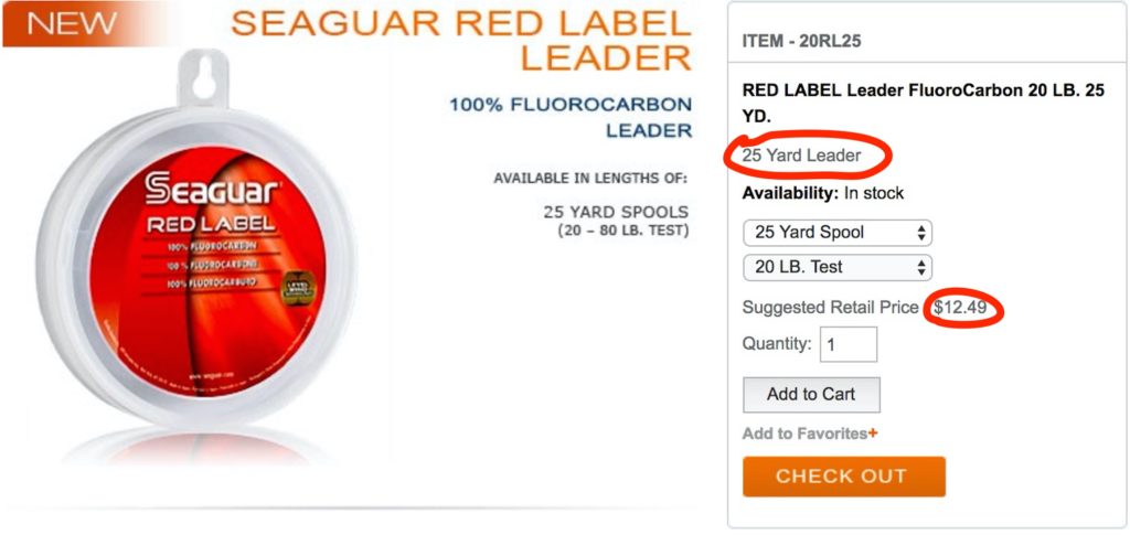 As shown in the screenshot above, the price per yard of this Red Label Fluorocarbon Leader line is $.49 cents per yard.