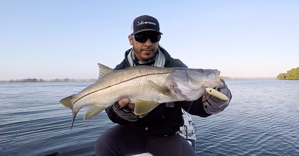 Unfortunately for Tony, his Moonwalker topwater lure was snapped off by a big hungry snook early in the morning on this trip.