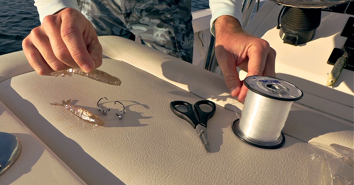 To start, you need two jigheads, two Power Prawn USA Junior lures, and a monofilament leader line.