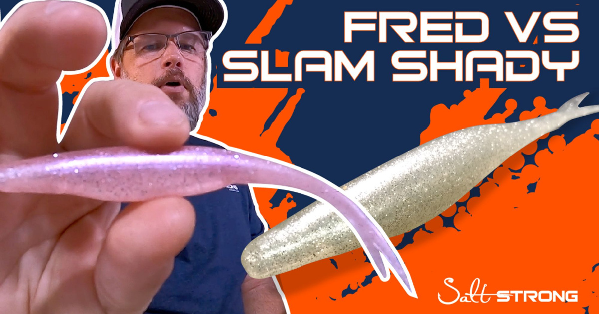 Our Slam Shady Jerk Shad is a white lure with silver flecks while the F.R.E.D. color is pink all around.