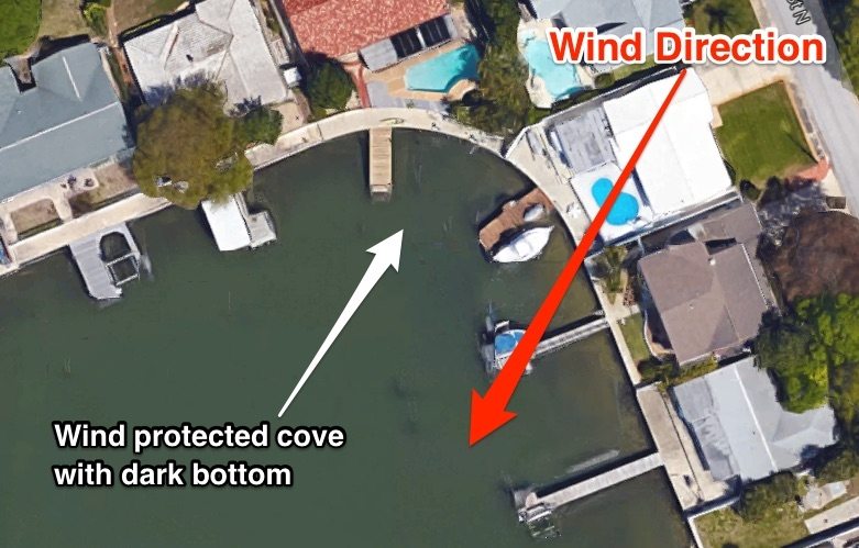 And this is important because calm areas are easier to fish since there is less wind drag on your line so casting and feeling bites is improved, and it’s easier to hold to a spot once fish are found to catch more (redfish, snook, and trout often hold in schools in winter months).