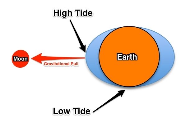 Water responds to the Moon’s gravitational pull creating a bulge that follows the moon. And since Earth is constantly spinning, the side of Earth directly opposite from the moon has a bulge as well… aka – High Tide.