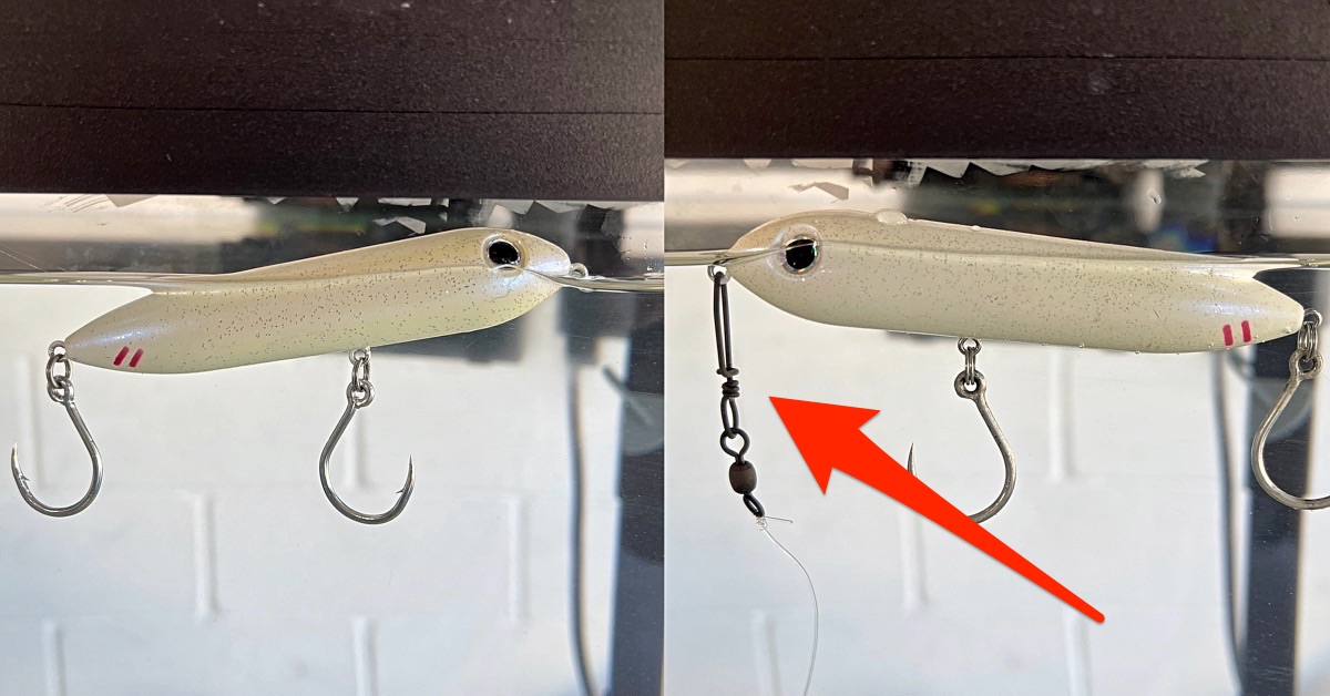 You’ll also notice how low the lure sits in the water when rigged with a snap swivel.