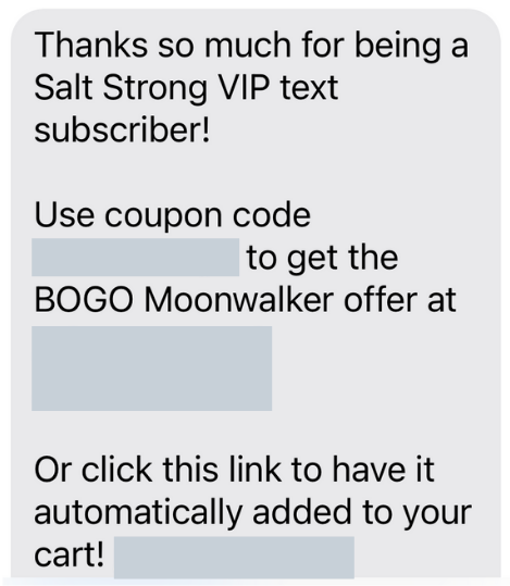 4. We’ll send you a text message with the BOGO Coupon Code that looks like this. NOTE: it could take a minute, so please be patient.