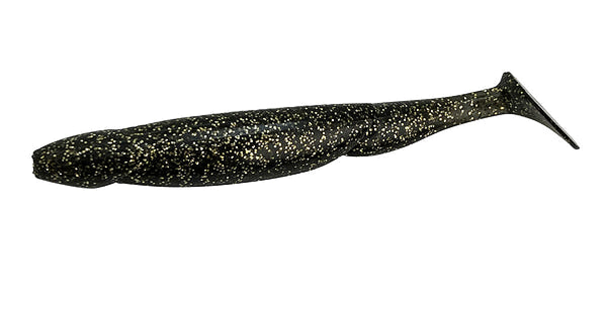 It is a 3.5-inch soft plastic lure made out of plastisol that is black with gold flakes scattered throughout the lure.